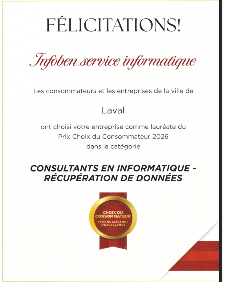 Infoben vous garantit un travail professionnel, rapide et à un coût compétitif par rapport à la concurrence. Notre service à la clientèle se distingue par sa disponibilité, son accueil chaleureux et sa prise en charge efficace.